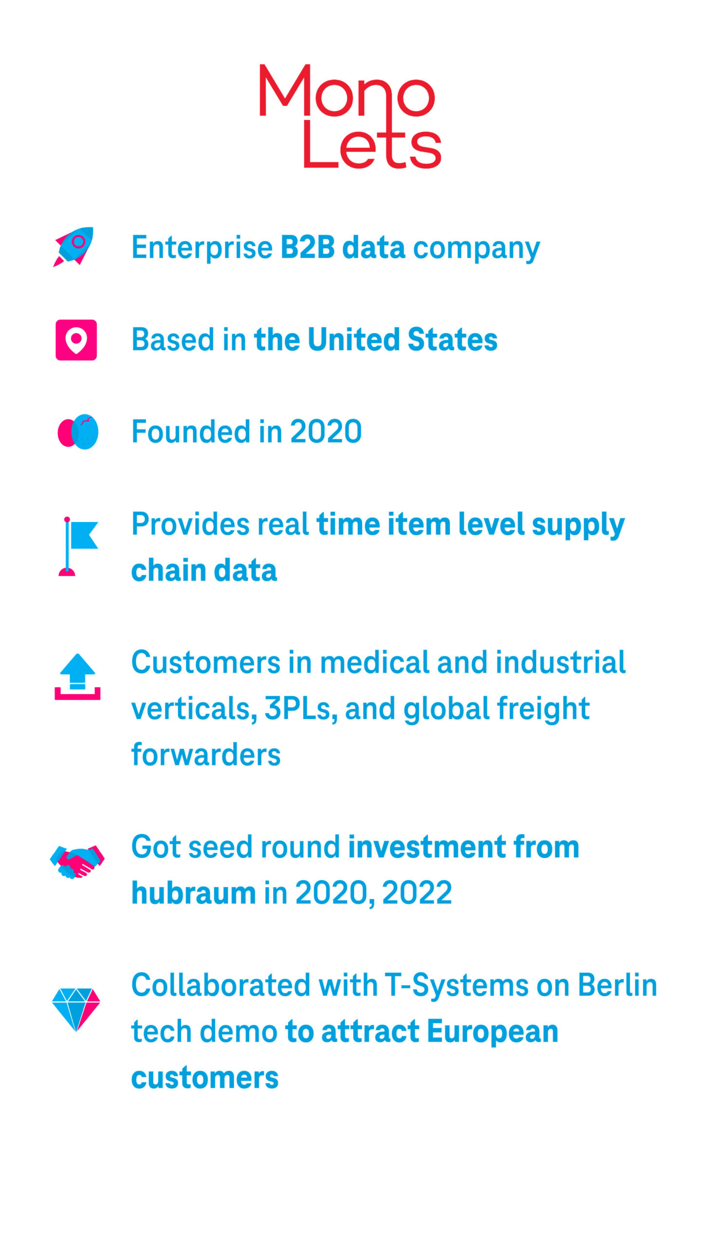 The use of state-of-the-art technology from MonoLets enhances the customer experience at the Telekom Industry Hub in Berlin. Here, customers are shown through a supply chain story — they are guided through an example warehouse and shown different demonstrations of products which could optimize the supply chain experience. Prior to MonoLets, we had a missing puzzle piece — we had to source the various services they offer from a number of different suppliers. But MonoLets have solved this issue, acting as a one-stop shop for tracking a product from manufacture to delivery.